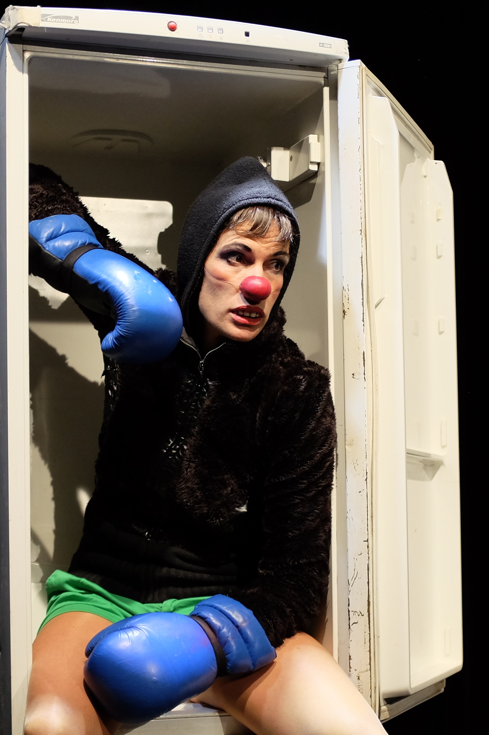 Son spectacle More Aura aborde le sujet. Pas frontalement, de biais. Mais en plein dans l’émotion. Un frigo confident, confessionnal ou cercueil, des gants de boxe et du rouge à lèvres. Christine, le personnage de son spectacle, nous fait rire pour nous faire du bien et pour nous décrasser les yeux :
