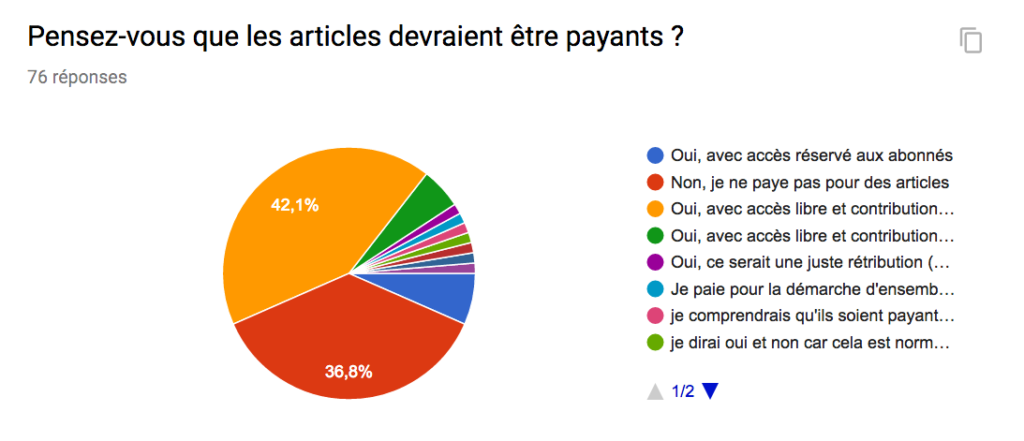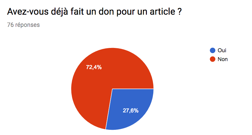 72% d’entre vous n’ont jamais fait de don pour un article, mais plus de 50% d’entre vous considèrent que ce serait normal de payer, par une contribution libre et volontaire. Que se passe-t-il? Manque de temps, impression que c’est compliqué, manque de confiance dans le paiement en ligne, impression que d’autres doivent déjà donner et que cela suffit ?