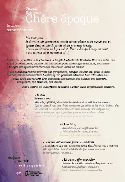 C’est ainsi que débute la « Lettre à la fragilité » de Sarah Roubato. Écrire des lettres est la belle manière, choisie par l’auteure, pour interroger le monde, nous faire partager des questionnements et mettre en mots les nôtres. Si les destinataires ne peuvent pas y répondre, chaque lecteur, lui, peut le faire, car ces lettres ressemblent à celles qu’on pourrait adresser à un véritable ami, celui avec qui on peut tout partager, ses colères, ses doutes, ses amours, ses pleurs, ses craintes, ses failles.
